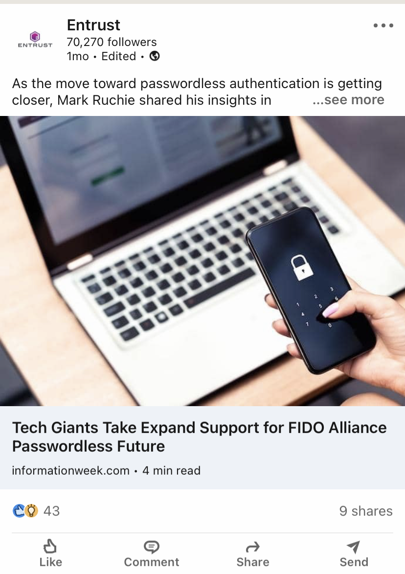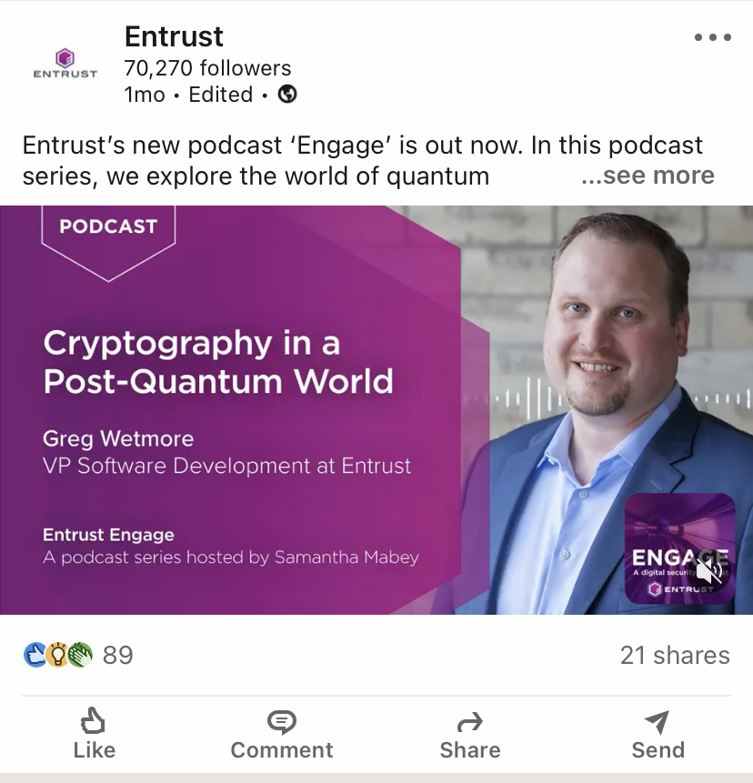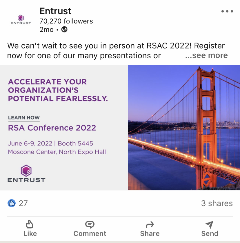 Entrust utilized social media to promote its webinars, podcasts, blogs, conferences, and company events.